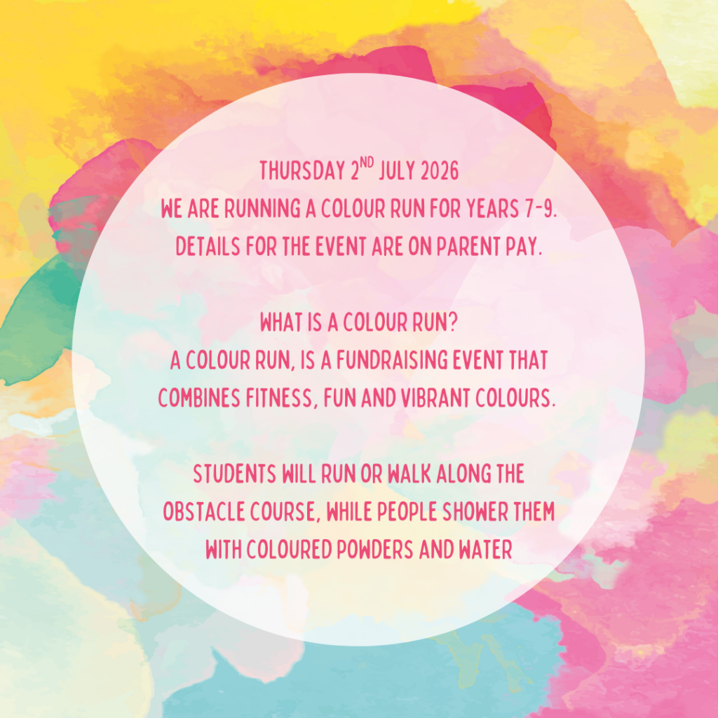 We’re excited to announce that on Thursday 2nd July 2026, students in Years 7–9 will be taking part in our vibrant and action‑packed Colour Run!