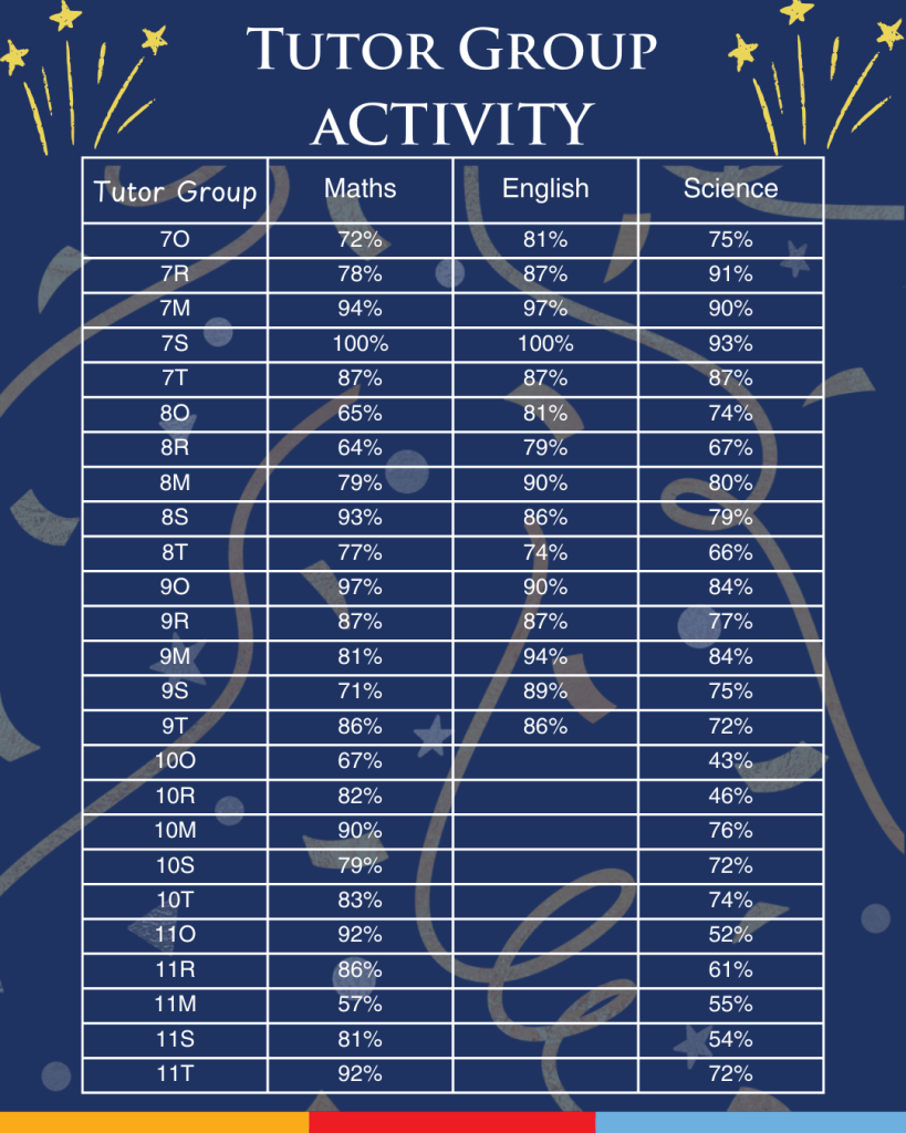 Well done to all tutor groups for your continued hard work and commitment. Whether you’re already hitting high percentages or making steady progress, every step counts and we’re proud of you all.