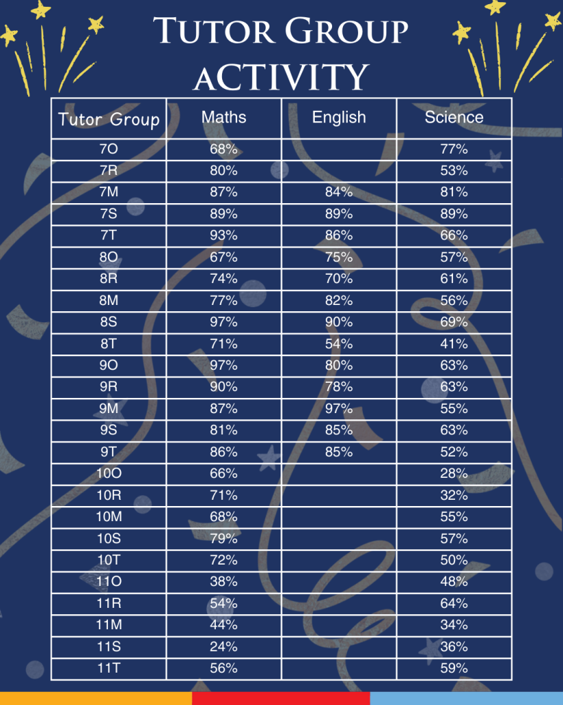 Well done to all tutor groups for your continued hard work and commitment. Whether you’re already hitting high percentages or making steady progress, every step counts and we’re proud of you all.