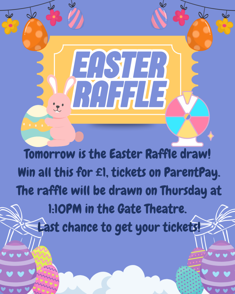 Tomorrow is the Easter Raffle draw! Tickets are £1 on ParentPay. The raffle will be drawn on Thursday at lunchtime in the Gate Theatre. Last chance to get your tickets!